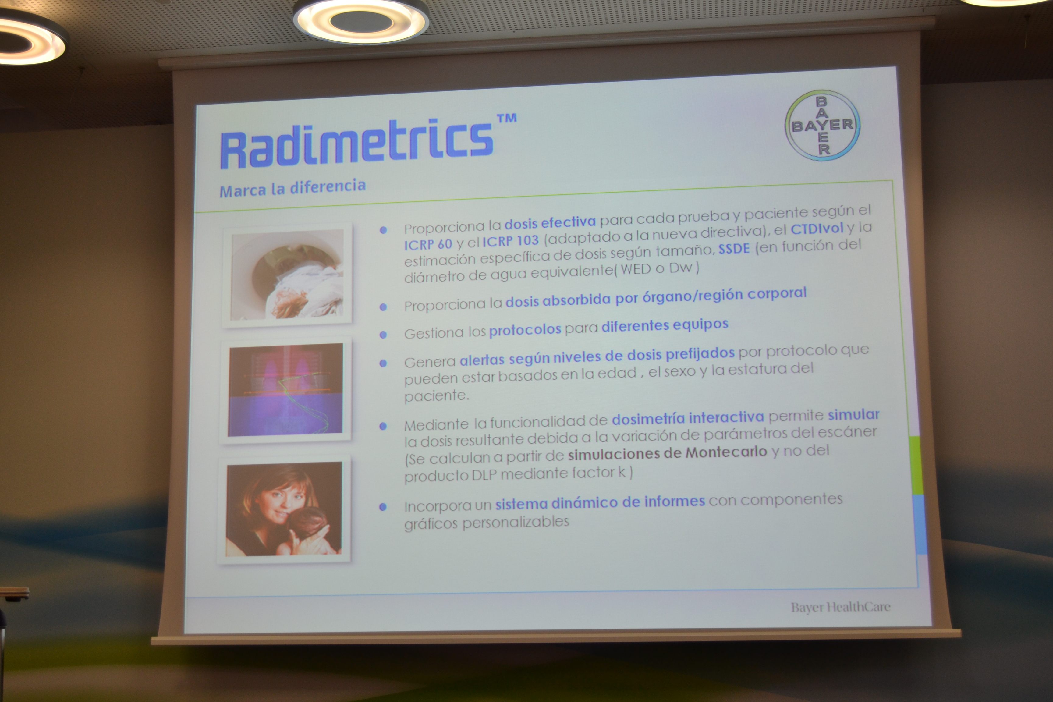 Para Bayer, la protección radiológica al paciente en el diagnóstico por la imagen es una prioridad. Como comentó Laia Febrer, Marketing & Service Manager, «la plataforma informática Radimetrics permite gestionar y controlar de forma integral la dosis de radiación, lo que podría ayudar a los centros sanitarios a adecuarse a la nueva directiva y dar un salto de calidad en radiología, que se traducirá en beneficio para el paciente».