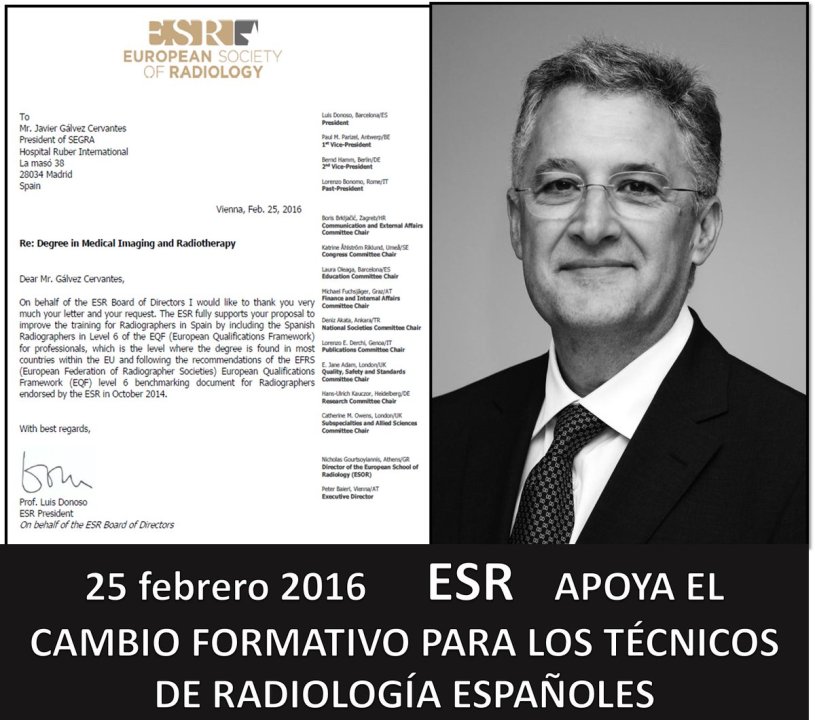 El actual presidente de la ESR, Dr. Luis Donoso, suscribe el comunicado de este jueves 25 de febrero, remitido a D. Javier Gálvez, presidente de SEGRA (Sociedad Española de Graduados y Técnicos de Radiología), expresando que «la ESR apoya totalmente su propuesta para mejorar la formación de los técnicos de rayos X en España mediante su inclusión en el nivel 6 del EQF (Marco Europeo de Cualificaciones) para profesionales, nivel donde se encuentra en la mayoría de países de la UE y que sigue las recomendaciones de la EFRS (Federación Europea de Sociedades de Radiographers – Técnicos Radiólogos formados en centros universitarios-) en la evaluación comparativa del nivel 6 dentro del Marco Europeo de Cualificaciones (MEC) para Radiographers, avalado por la ESR en octubre de 2014». Esta carta es un comunicado enviado para información a todos los representantes de colectivos de Técnicos de España, grupo denominado Comisión Interinstitucional.