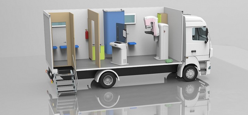 Reportaje sobre el interior de una Unidad Móvil de mamografías. Espacios, Protección Radiológica, procedimientos, compresión mamaria, roles del Técnico de Radiología.
