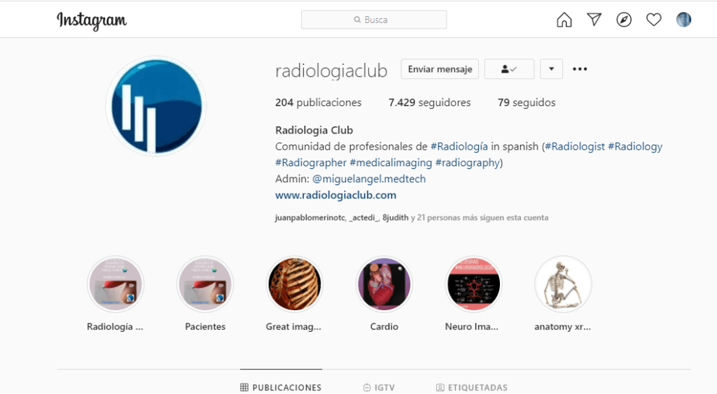 Este artículo sirve para detectar grandes cuentas en Instagram sobre contenidos en Radiología Médica para profesionales (Radiólogos y Técnicos), aunque también para analizar qué utilidades tiene publicar contenido en Instagram.